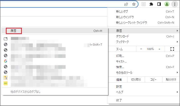 (2)開いたメニューから[履歴]にマウスカーソルを合わせ、左に開いたメニューから[履歴]をクリックする。
