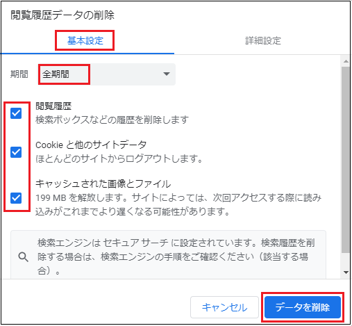 (4)[基本設定]タブを選び、期間のプルダウンメニュー([1時間以内]、[過去24時間]、[過去7日間]、[過去4週間]、[全期間])から希望する期間を選択して、削除するデータ項目([閲覧履歴]、[Cookieと他のサイトデータ]、[キャッシュされた画像とファイル])にチェックを付け、最後に[データを削除]をクリックする。